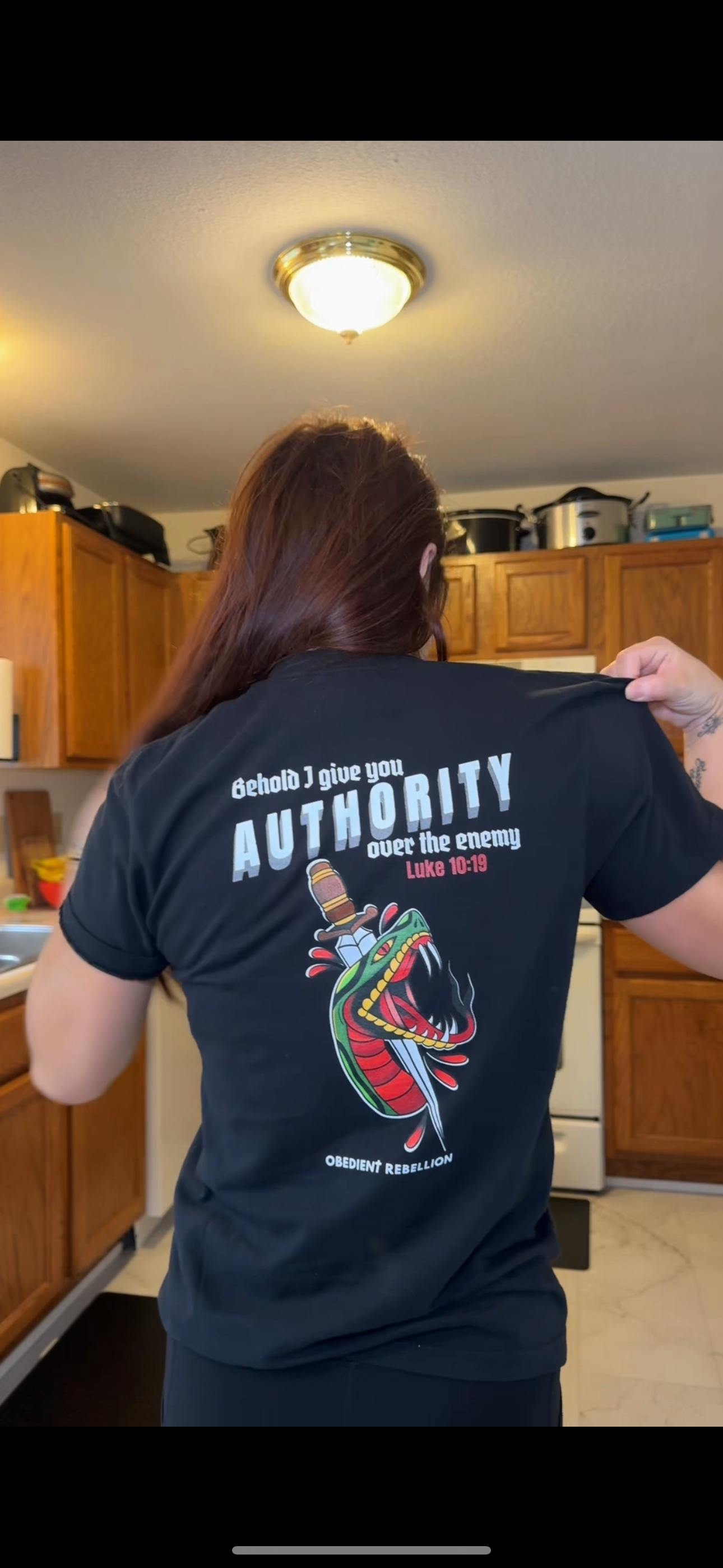 The Authority Over the Enemy T-Shirt by Obedient Rebellion showcases bold artwork inspired by Luke 10:19: “Behold, I give you authority over the enemy.” Featuring a serpent crushed beneath the sword, this premium graphic tee blends impactful design with durable streetwear style.