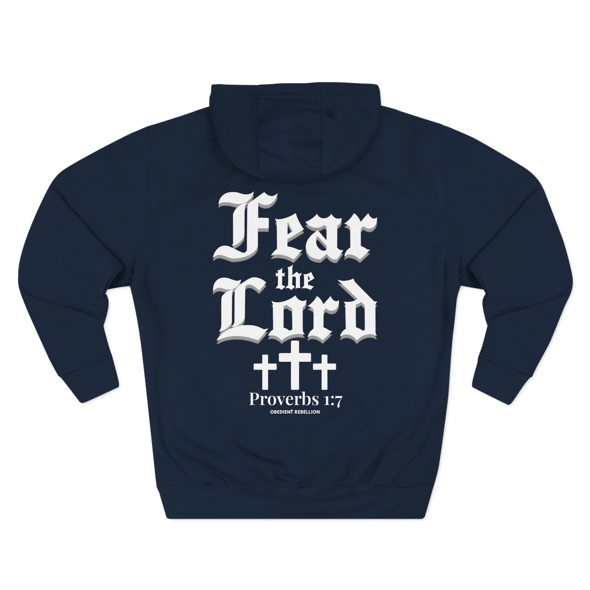 The Fear the Lord Hoodie by Obedient Rebellion blends Scripture inspiration with bold streetwear design. Featuring distressed gothic lettering and a three-cross detail, this pullover highlights Proverbs 1:7 — “The fear of the Lord is the beginning of knowledge.”