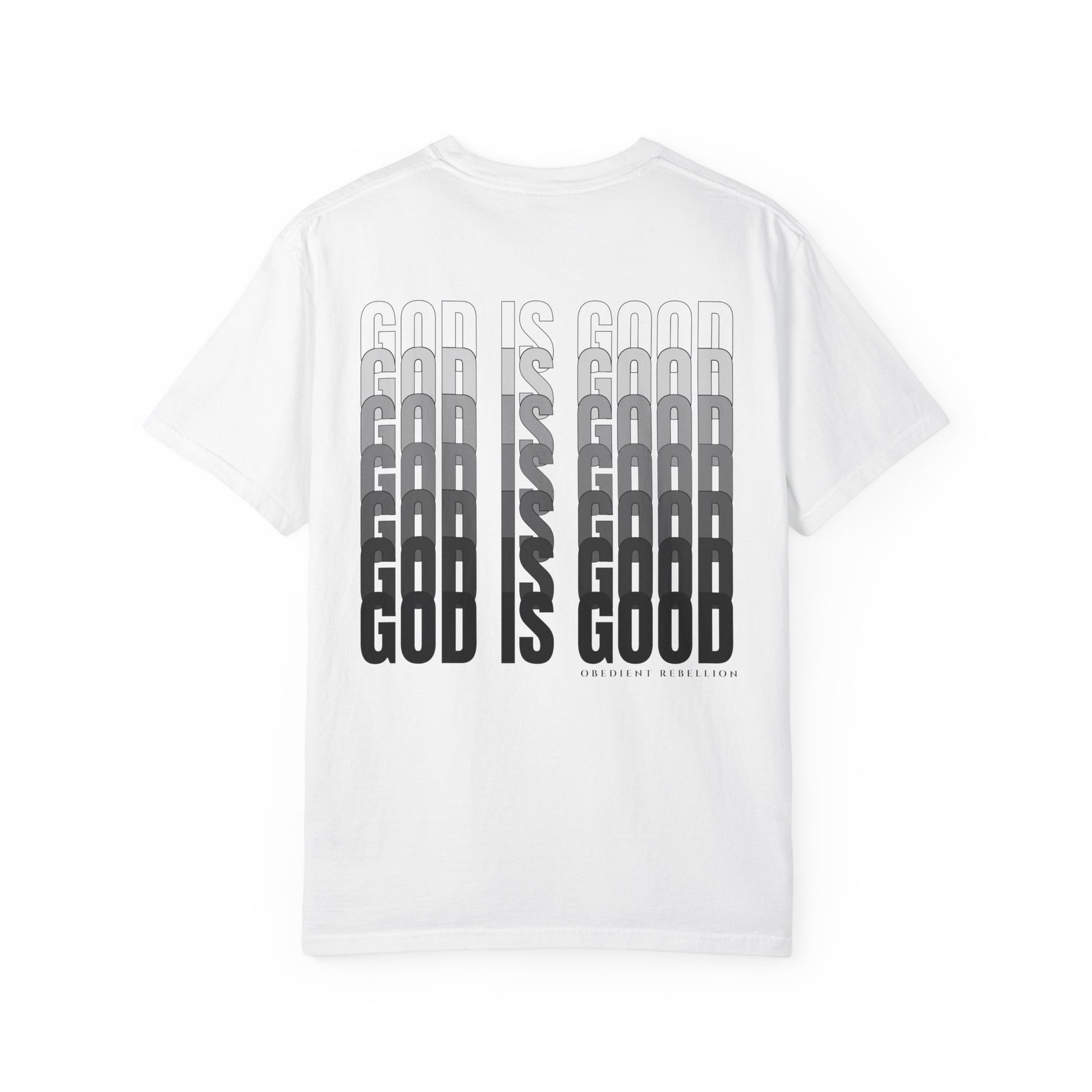 The God Is Good Gradient T-Shirt features a bold stacked text design that fades from deep gray to bright white, creating a striking modern streetwear look. Finished with a minimal chest print and the Obedient Rebellion™ logo, this tee blends graphic style with everyday comfort.
