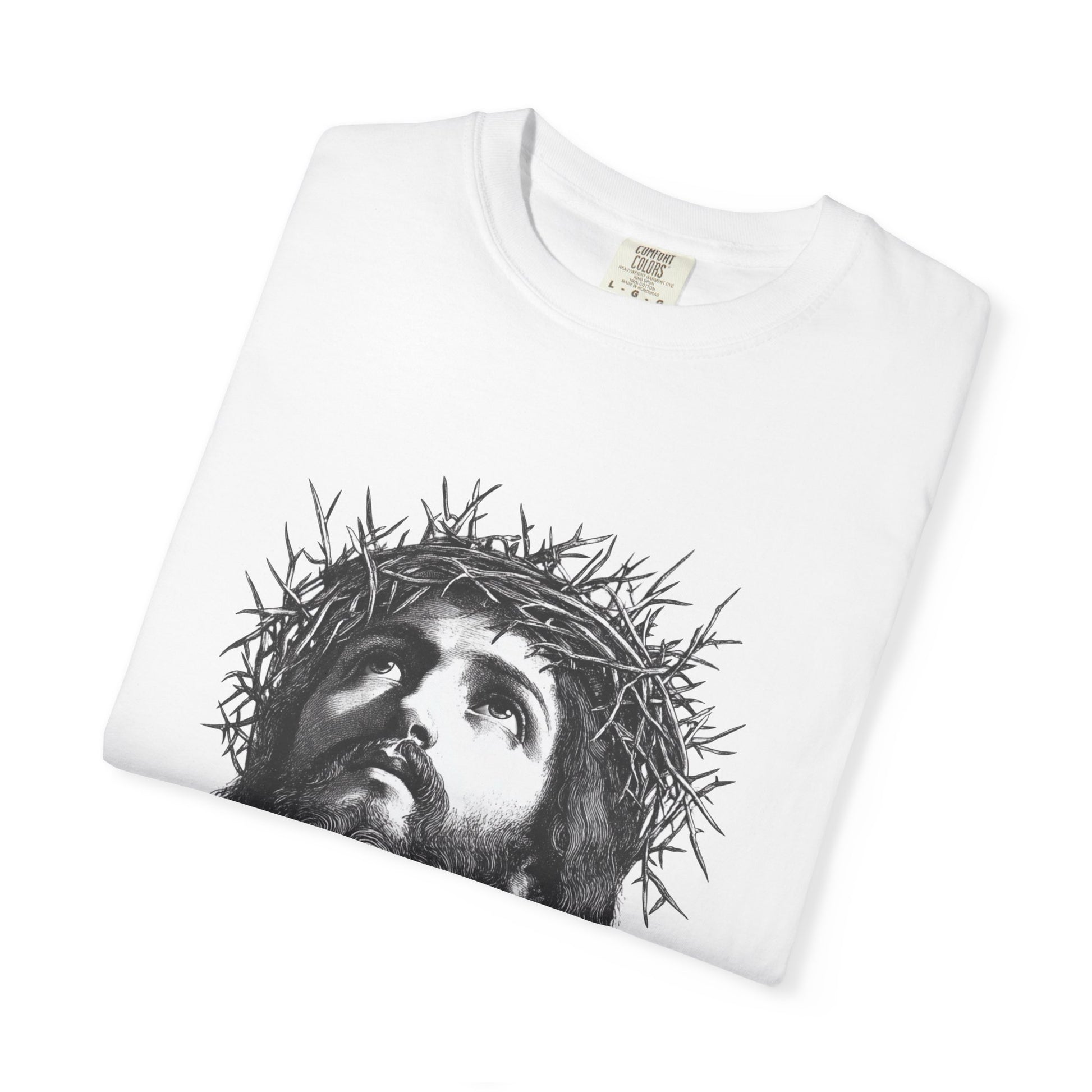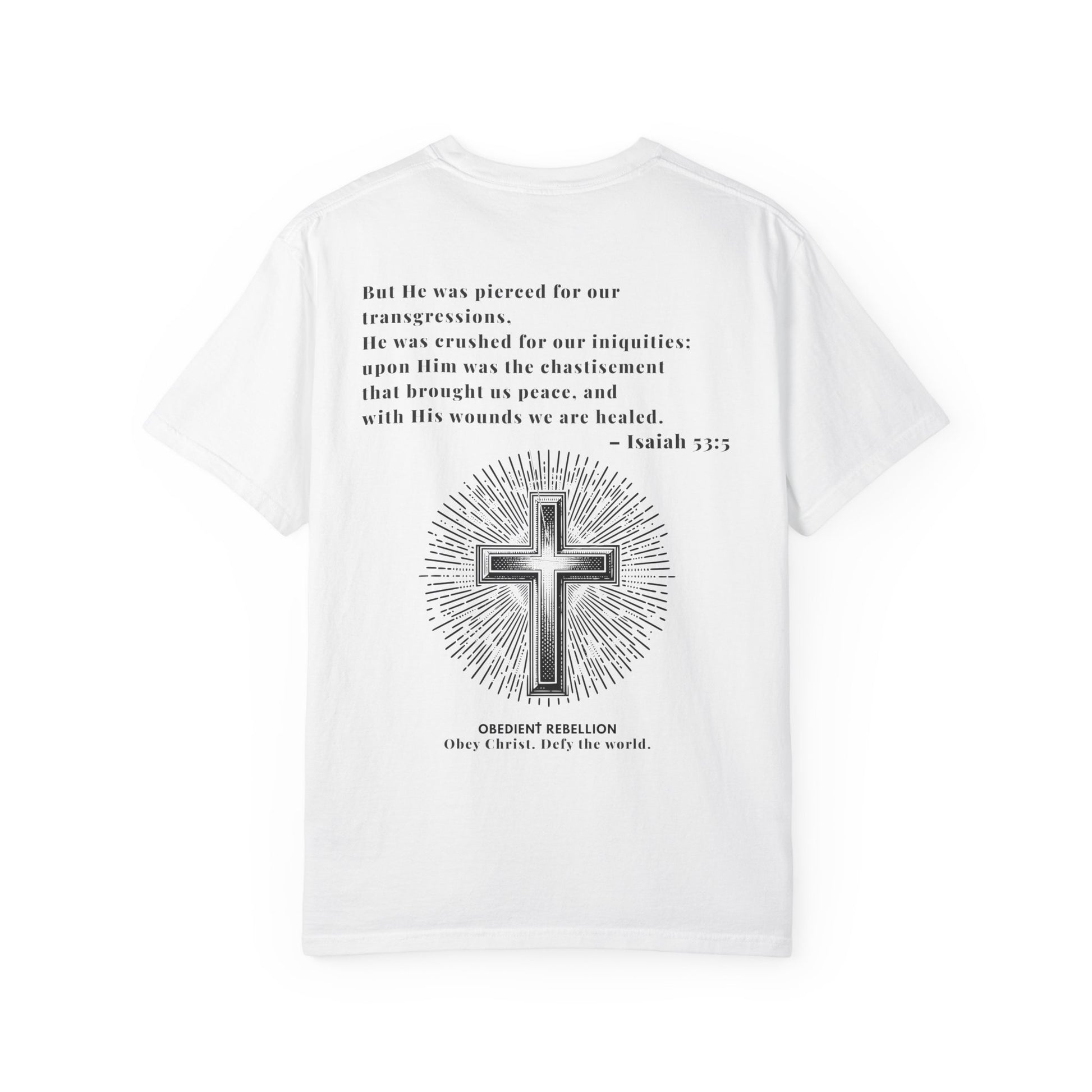The Isaiah 53:5 shirt by Obedient Rebellion features a bold monochrome portrait design for a striking streetwear look. Printed on premium Comfort Colors® cotton, this heavyweight tee combines durability with a relaxed, vintage-inspired fit.