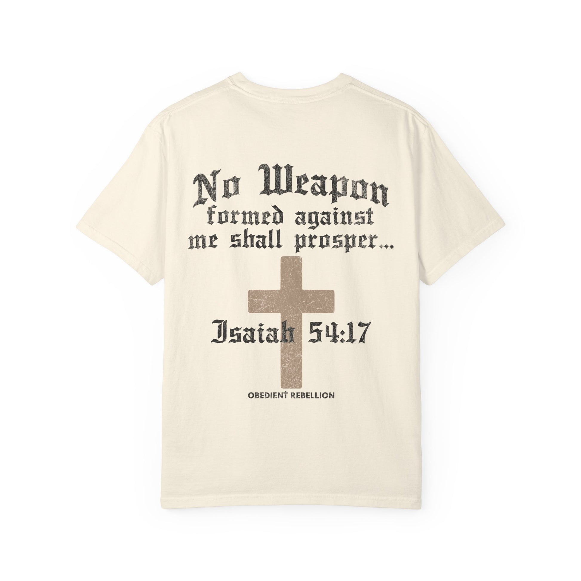Back: Full Isaiah 54:17 design with cross artwork