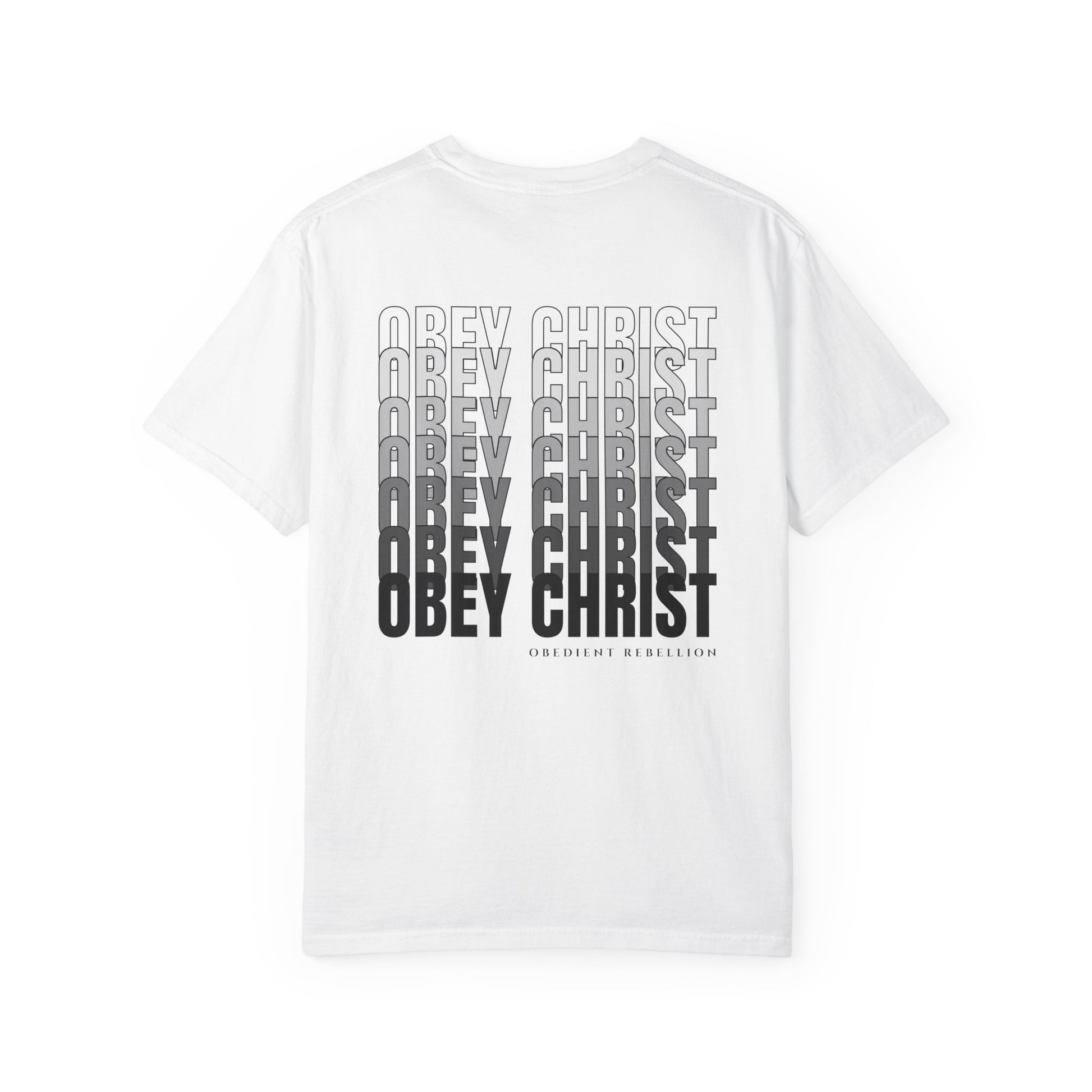 The Obey Christ T-Shirt by Obedient Rebellion delivers a bold, scripture-inspired streetwear aesthetic. With a minimal front chest detail and a large stacked typography design on the back, this heavyweight tee balances comfort and impact.