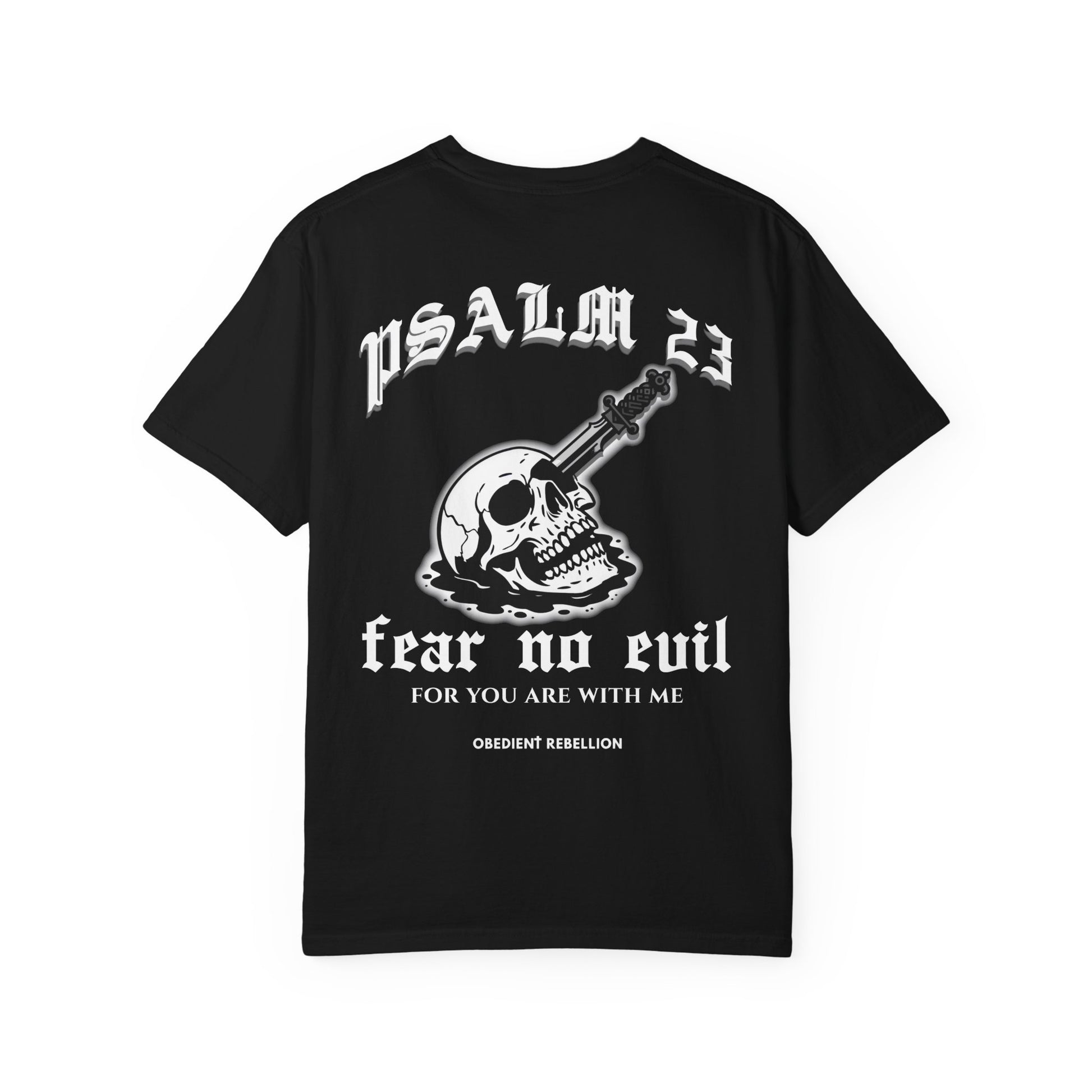 The Psalm 23 “Fear No Evil” T-Shirt by Obedient Rebellion features a bold skull and sword graphic with Old English lettering, inspired by Psalm 23:4 — “I will fear no evil, for You are with me.” Designed on a heavyweight Comfort Colors® tee, this piece blends durable construction with faith-inspired streetwear design.
