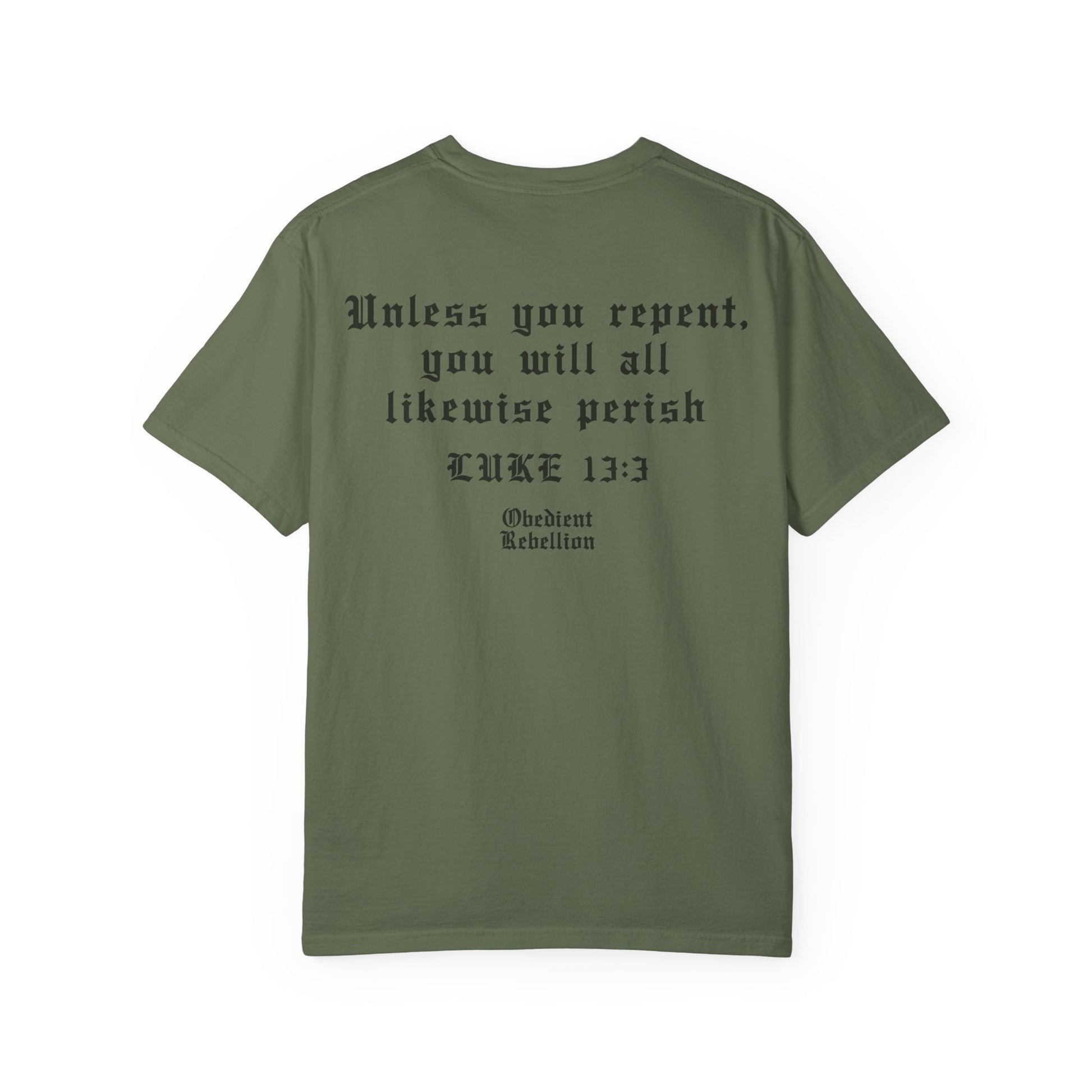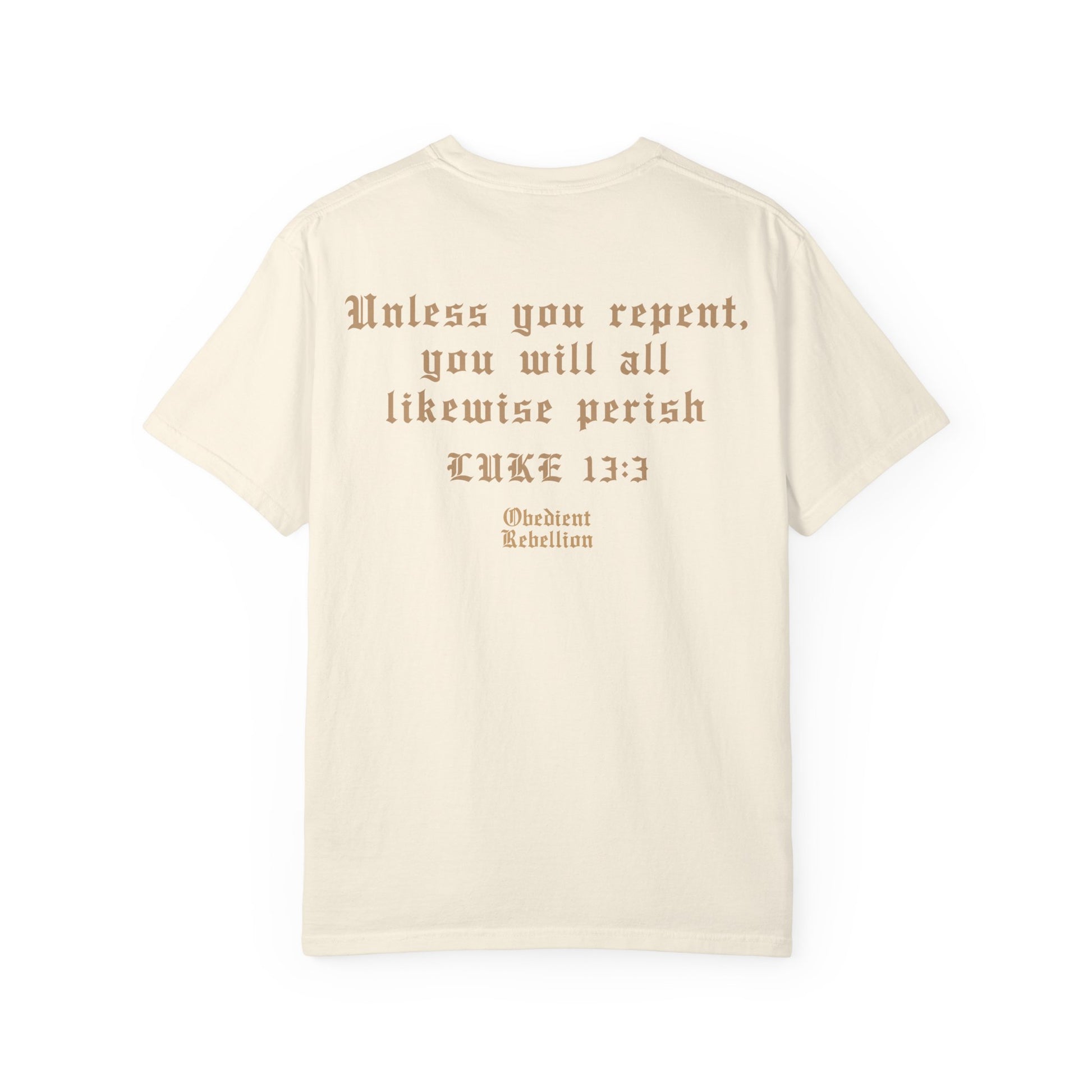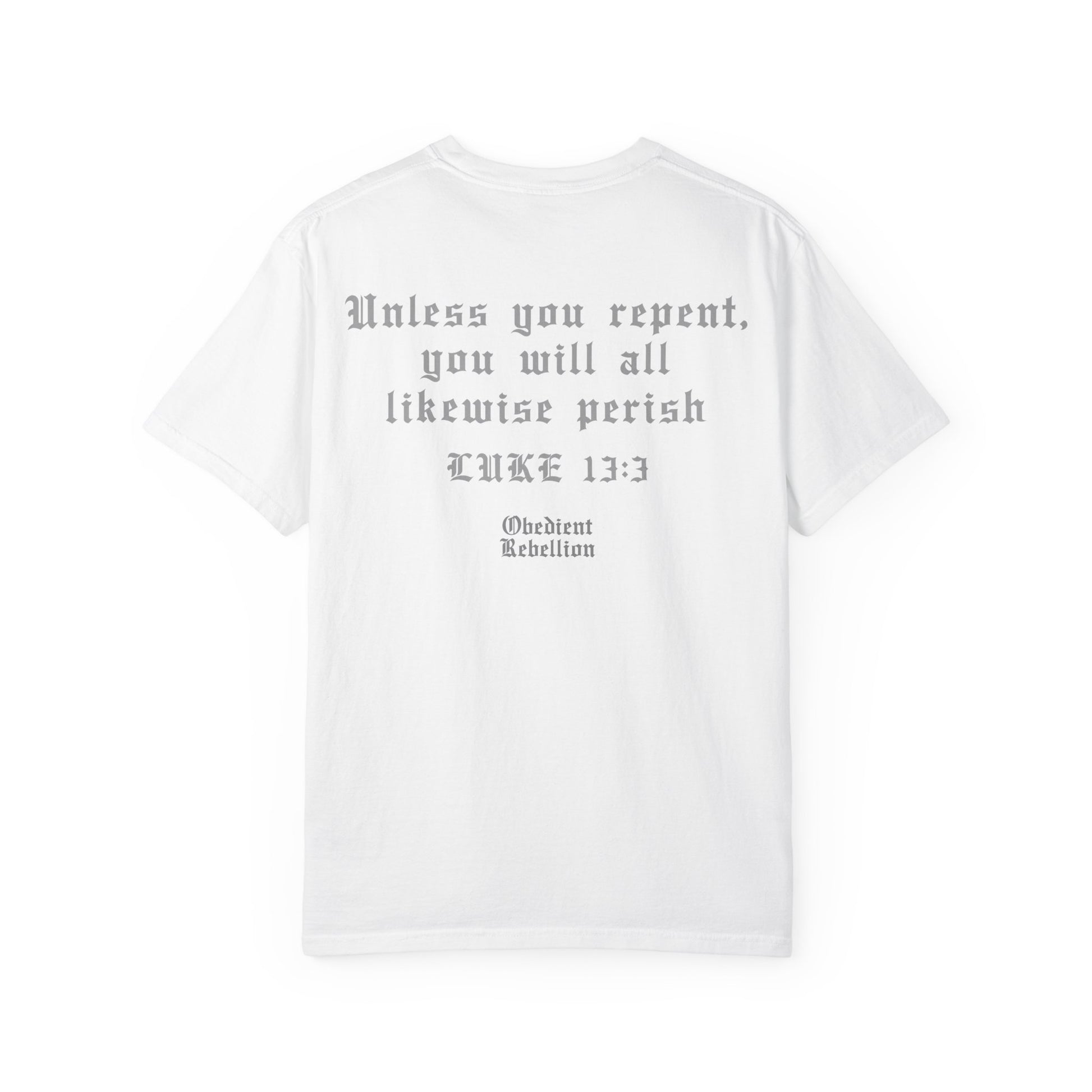 The REPENT Tone-On-Tone T-Shirt by Obedient Rebellion brings together minimalist streetwear design and scripture-inspired detail. Featuring subtle Old English lettering across the chest, the monochrome print offers a sleek and modern aesthetic with timeless impact.