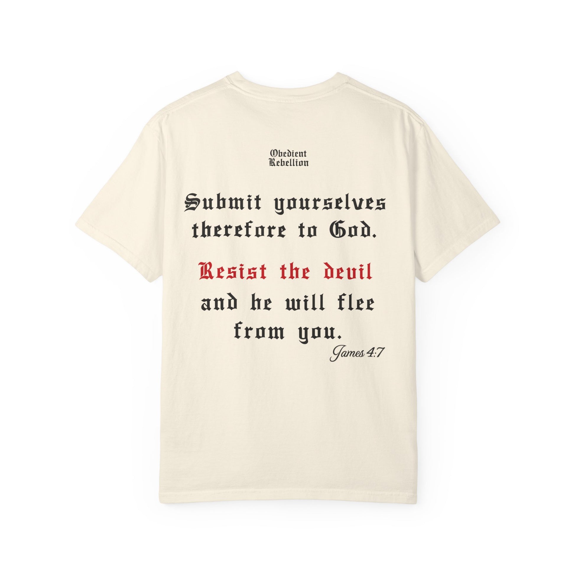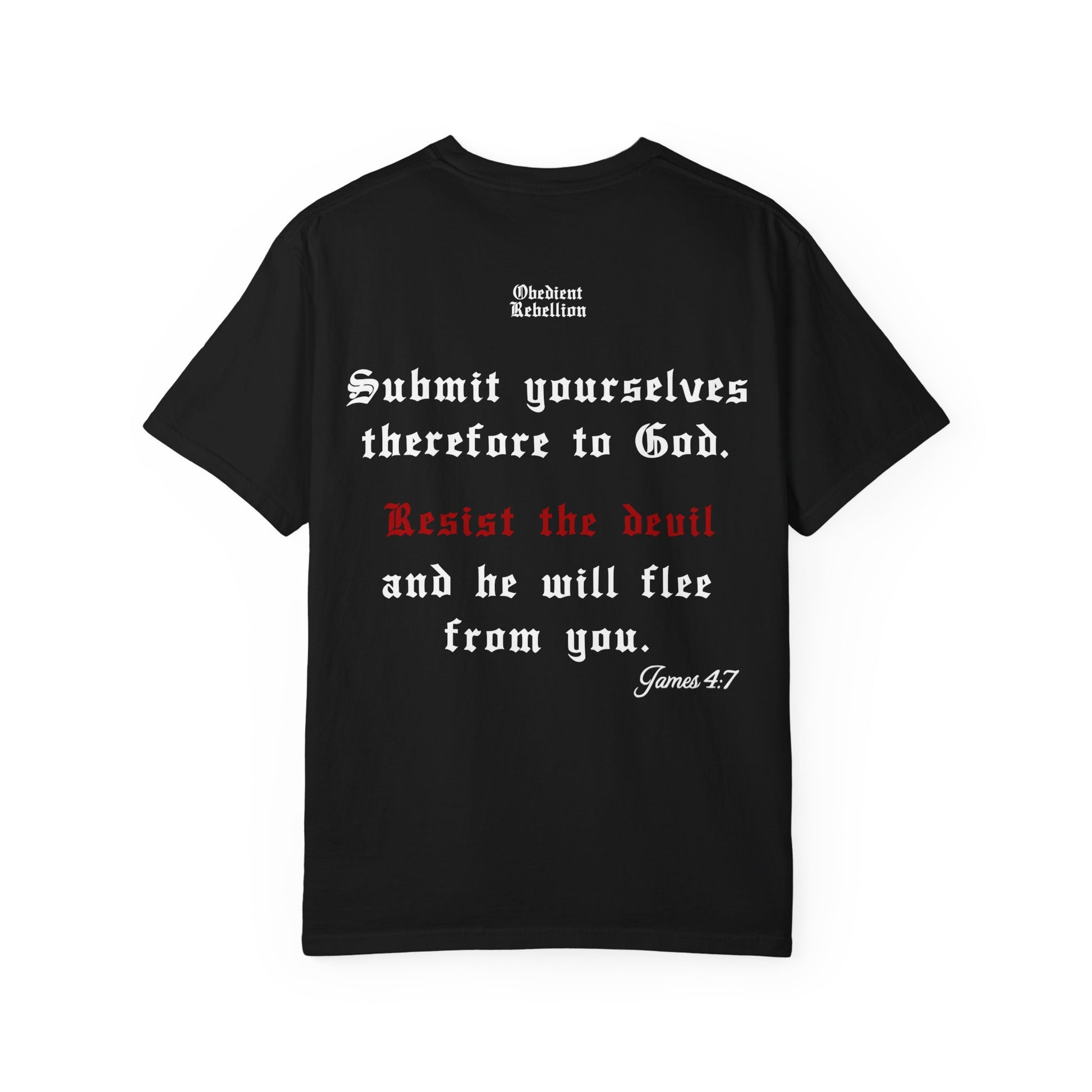 The Devil Is a Liar T-Shirt by Obedient Rebellion features Scripture references on both front and back for bold impact. John 8:44 is displayed across the chest: “The devil is a liar,” while James 4:7 is printed on the back: “Submit yourselves therefore to God. Resist the devil, and he will flee from you.”